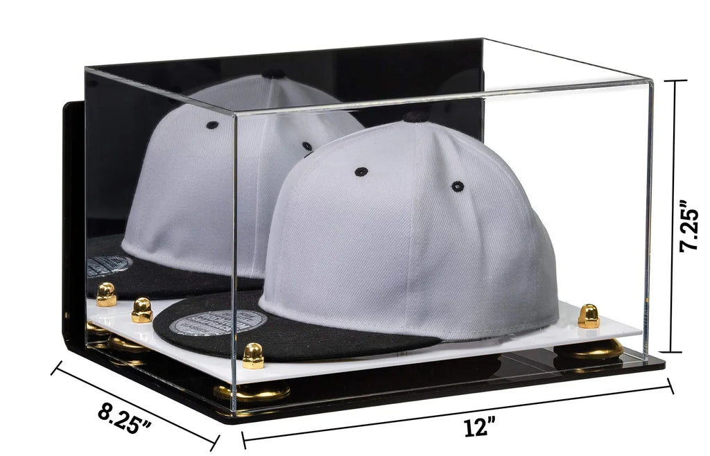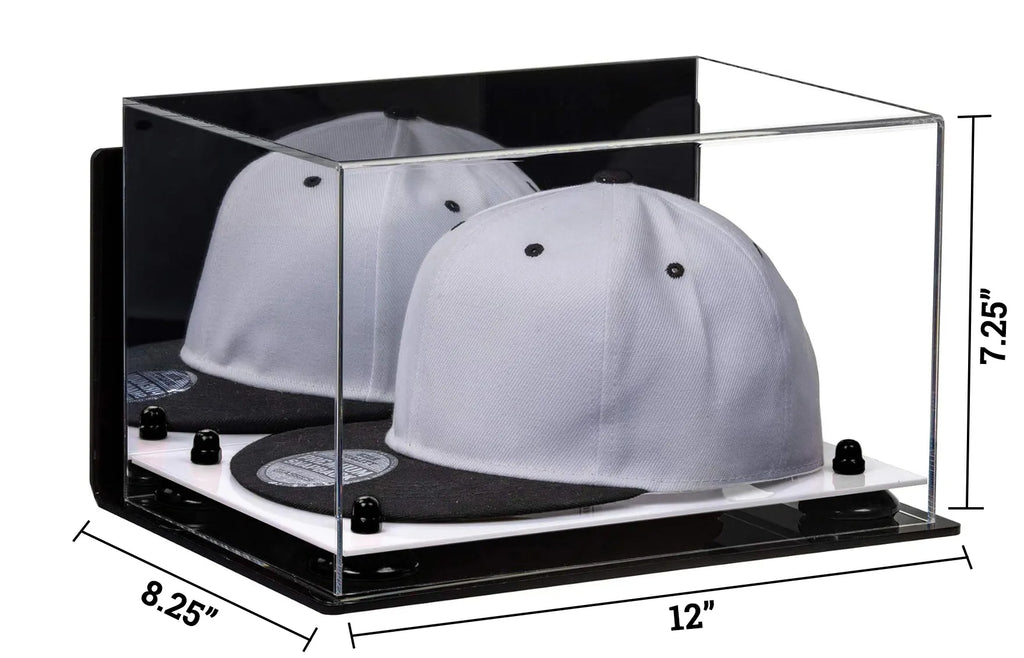 The baseball cap or snapback hat display case is designed with precision to perfectly fit your collectibles. Its external dimensions are 12 inches in length, 8.25 inches in depth, and 7.25 inches in height. Internally, the display space measures 11.75 inches long, 8 inches deep, and 6.4 inches high above the platform. With these dimensions, your hats will be securely housed and beautifully showcased. This case features wall mounts, for the non wall mounted version, please refer to the listing here.