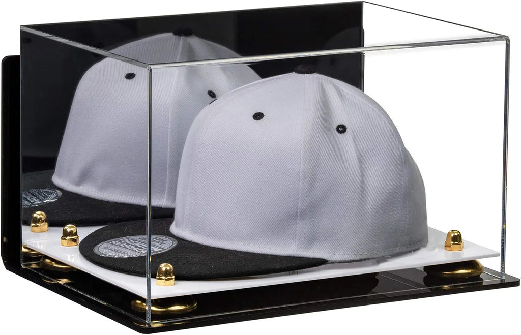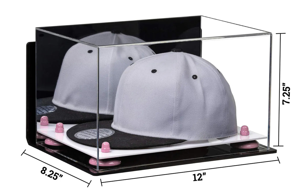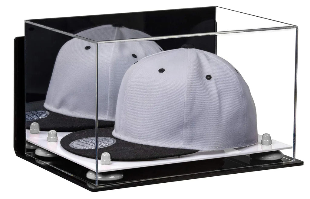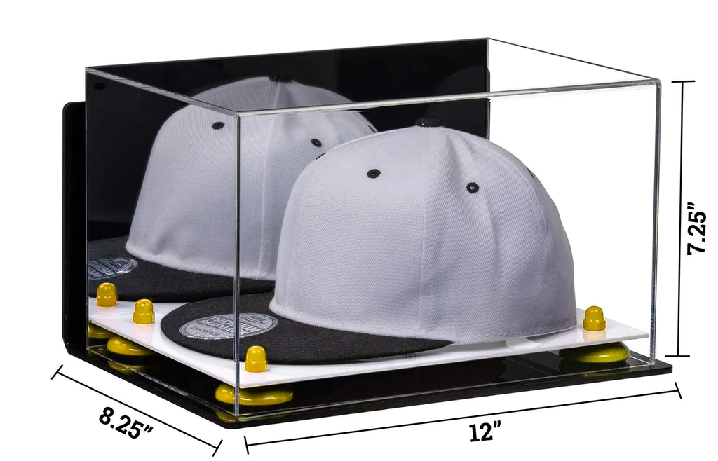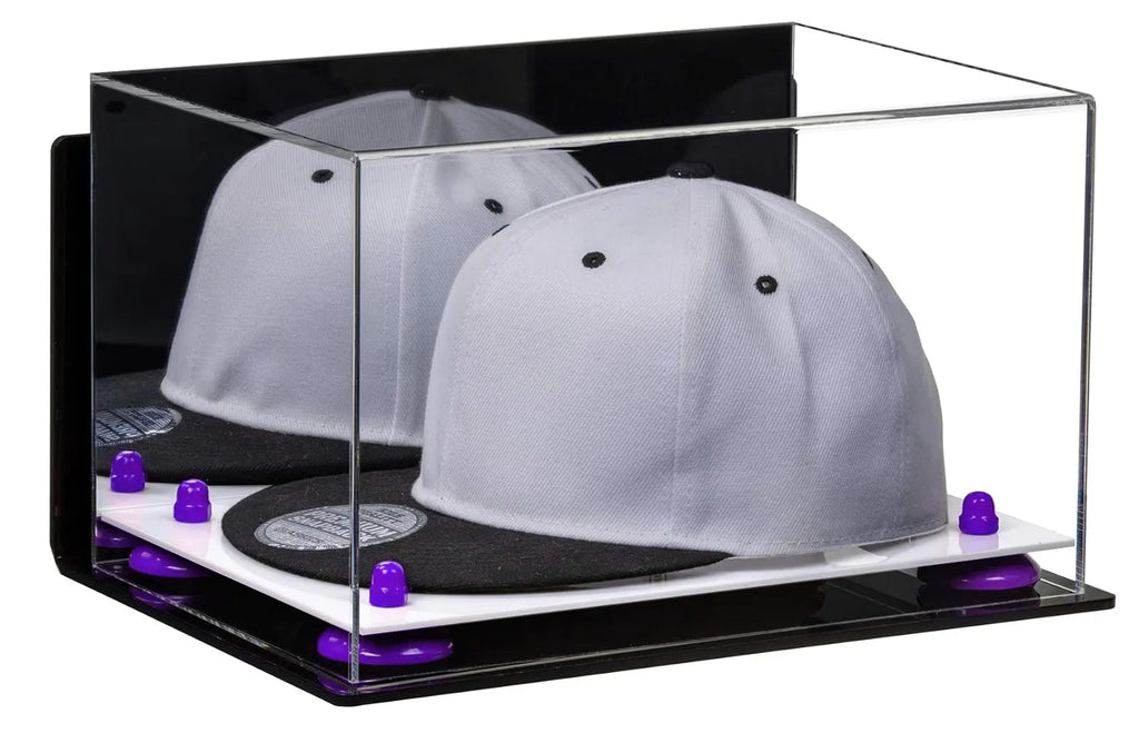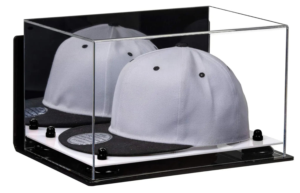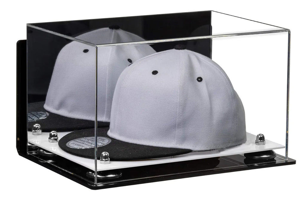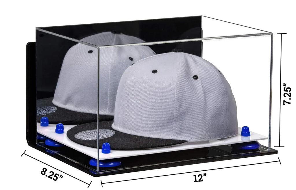 Display your prized sports memorabilia with elegance and security in our Snapback Hat or Baseball Cap Display Case - Mirror Wall Mount. This premium-quality clear acrylic display cube is perfect for showcasing collectible hats, offering a full side view for a stunning presentation. The two-tiered base with metal risers in 12 different colors adds a sophisticated touch, while the mirrored back enhances the visual depth of your display. Easy to assemble and wall-mountable, this display case provides unparalleled protection against dust, light, and accidental damage, ensuring your treasured items remain safe and stylishly displayed.
