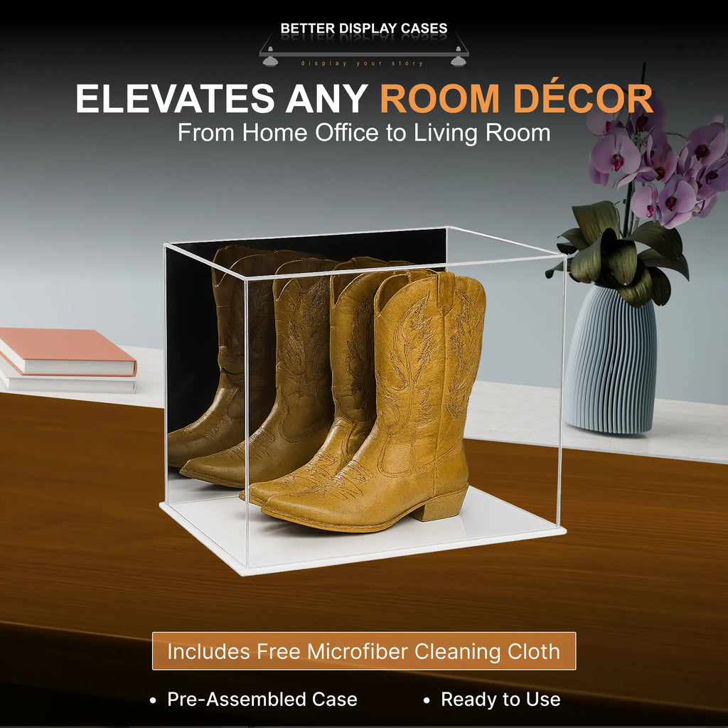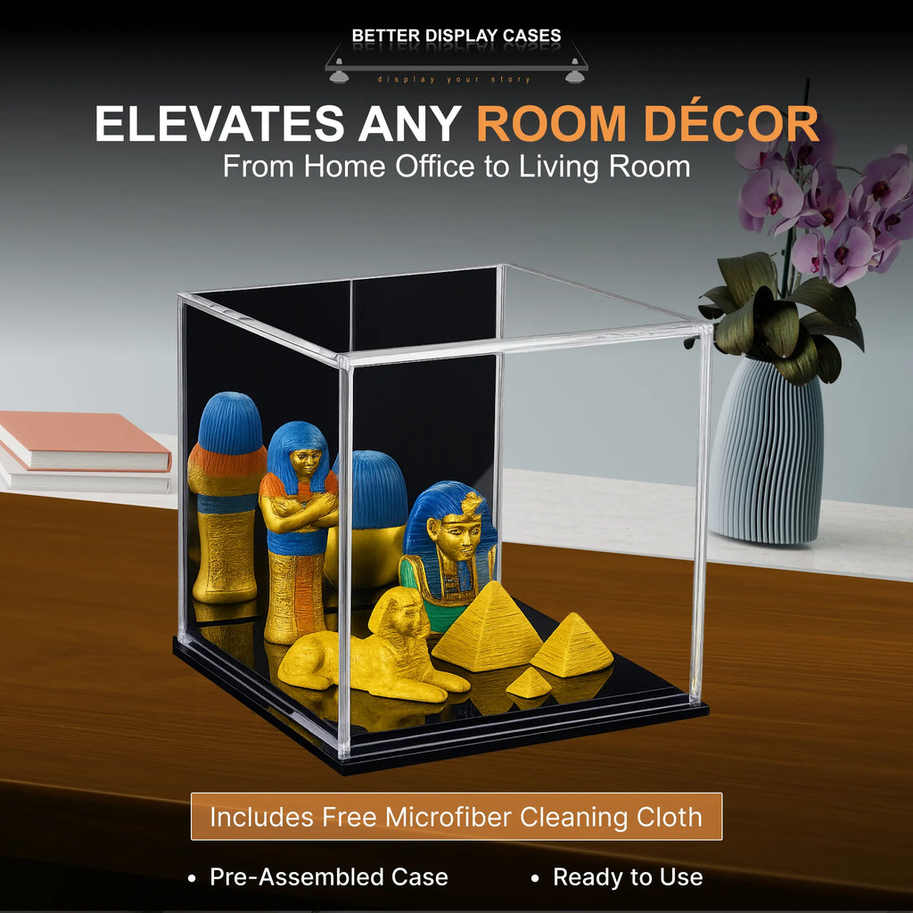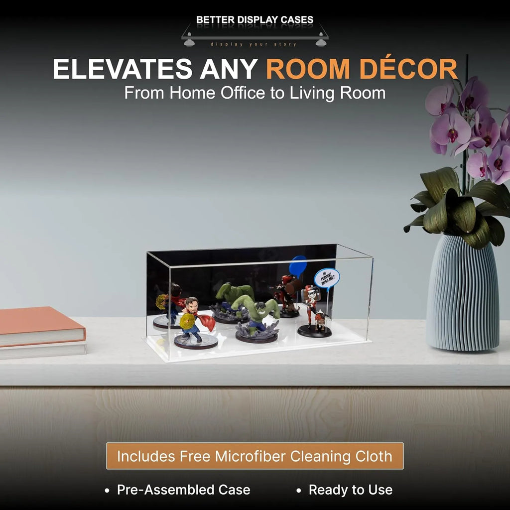 We use durable acrylic our cases are lighter, safer, and clearer than glass. The front, back, and tops of our clear cases are molded from a single sheet of acrylic, giving them an aesthetically pleasing roll-over appearance with fewer seams. Our mirrored cases give a deeper and fuller look to your items. The double sheeted black acrylic base also provides a faint dark reflection for your items which gives an appearance that compliments any surrounding decor.