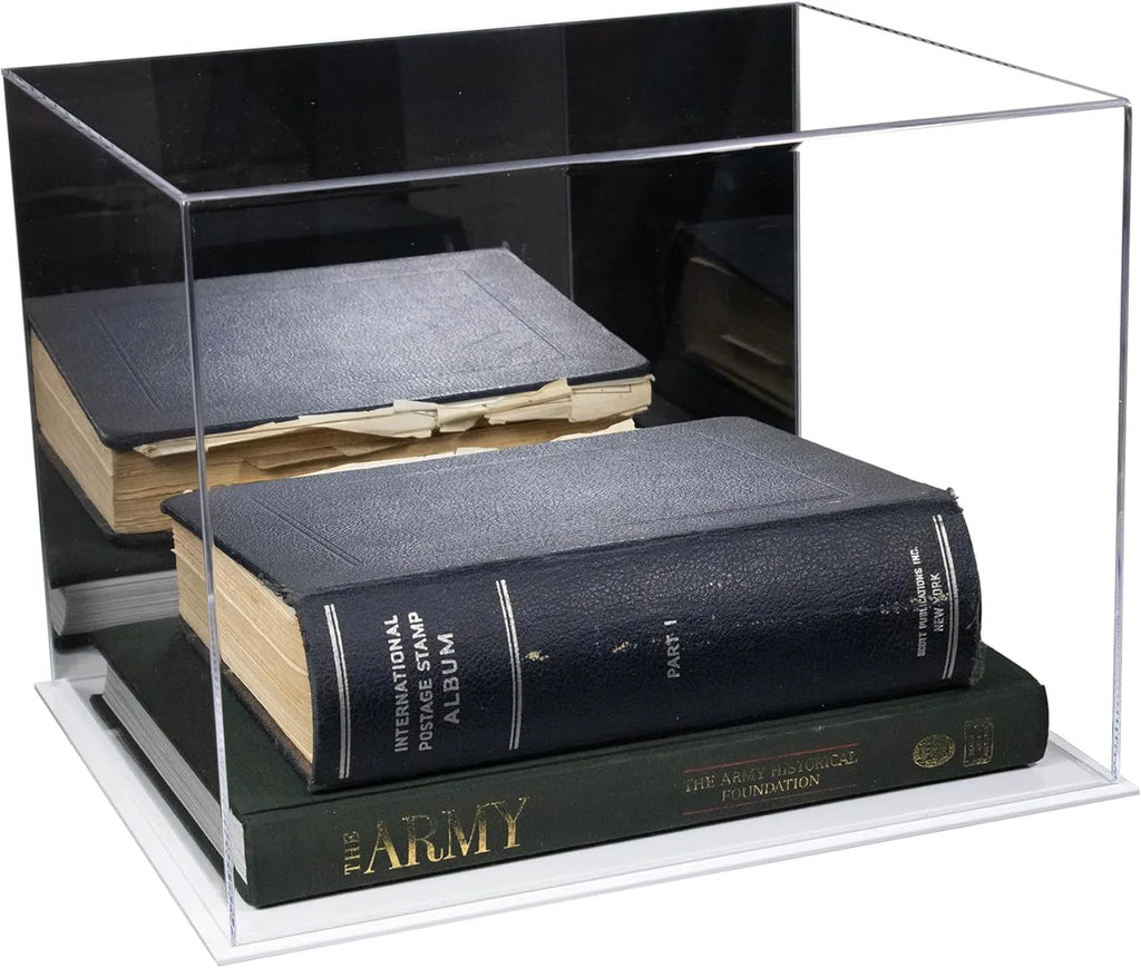 The top of our Acrylic Book Display Box is made from thick, handmade acrylic that is smooth to the touch and ultra-clear; perfect for displaying a book, bible, stamp or coin collection, board games or puzzles. The base is made from 2 sheets of jet black acrylic (1 large and 1 smaller) fused together, letting the top fit perfectly around the smaller one. FREE MICROFIBER cleaning cloth included with each case!