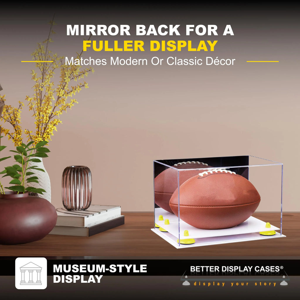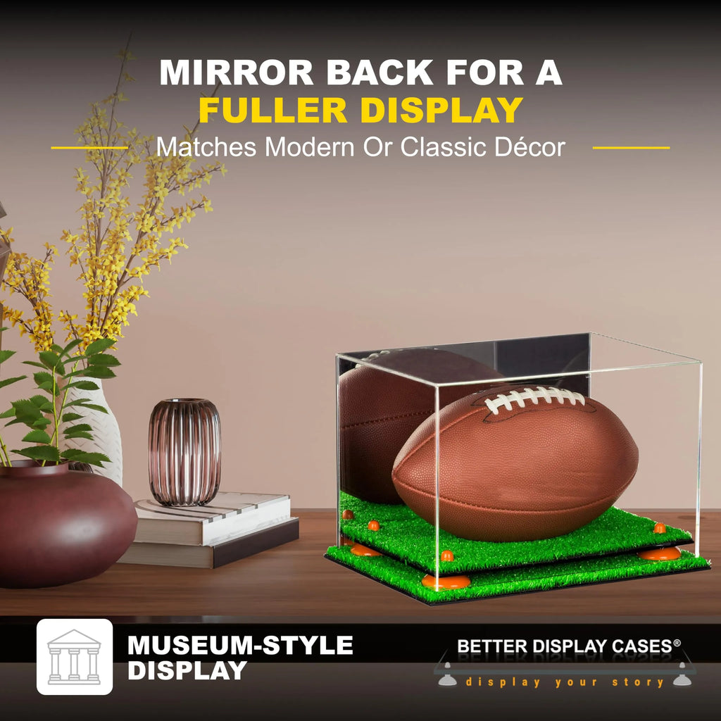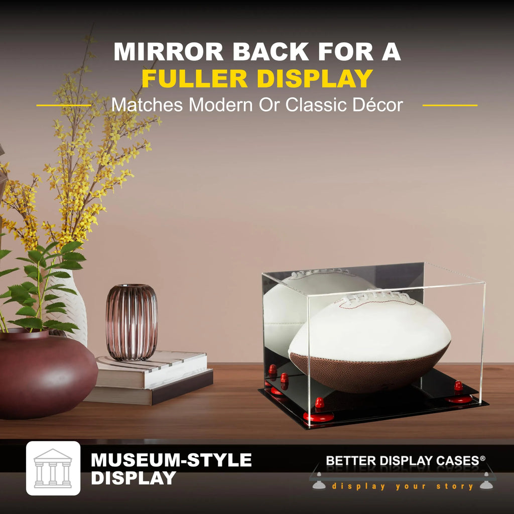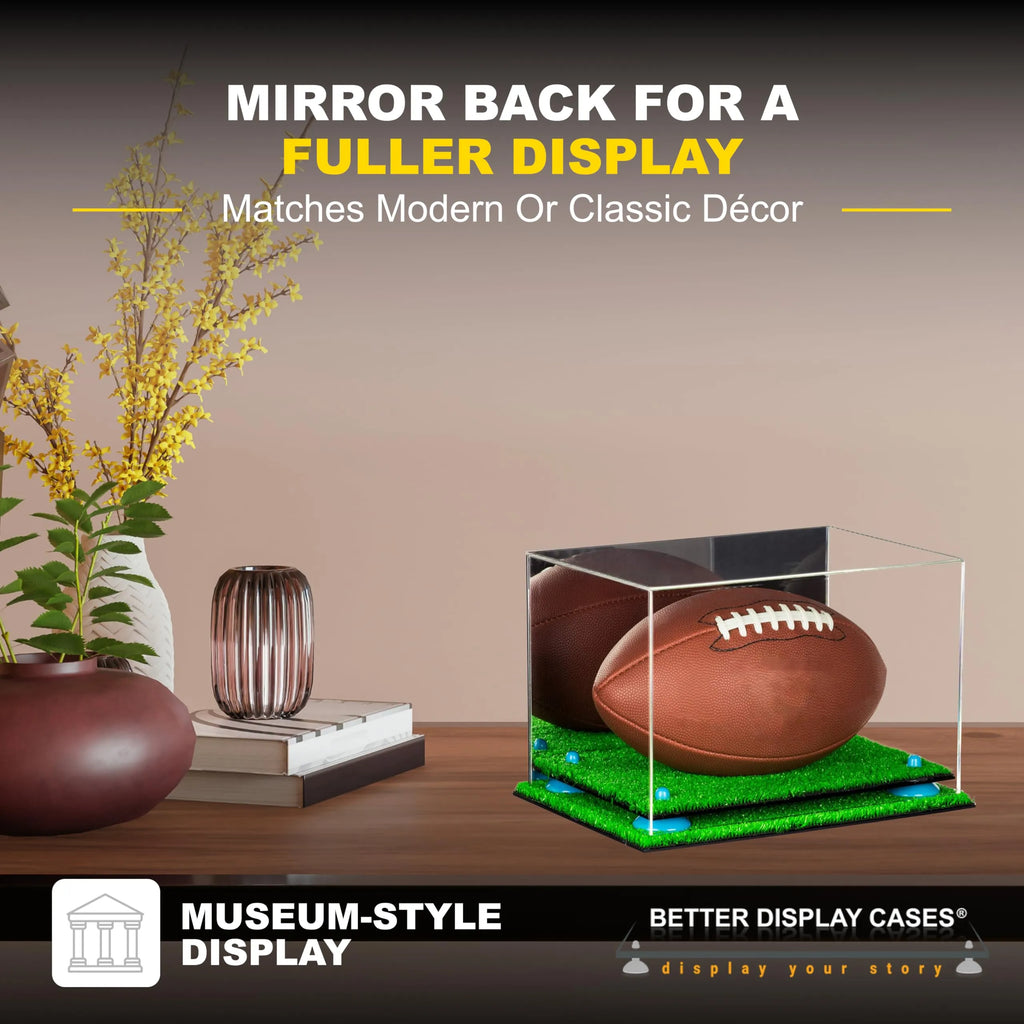 Protect and showcase your cherished memorabilia with our full size football display case. Handcrafted from high-quality, crystal-clear acrylic, this display case is designed to highlight your prized football while keeping it safe from dust, spills, and damage. The two-tiered base, available in black, white, turf, clear, or mirror acrylic, is paired with your choice of metal risers in a variety of colors, including gold, silver, black, and more, to perfectly match your décor or team colors. The mirrored back adds depth to your display, creating a fuller appearance that makes your football the centerpiece it deserves to be. With dimensions designed to accommodate most full-size footballs, this display case is the perfect gift for any sports fan.