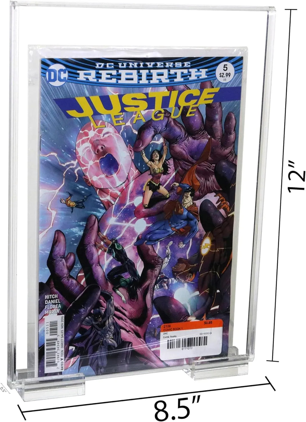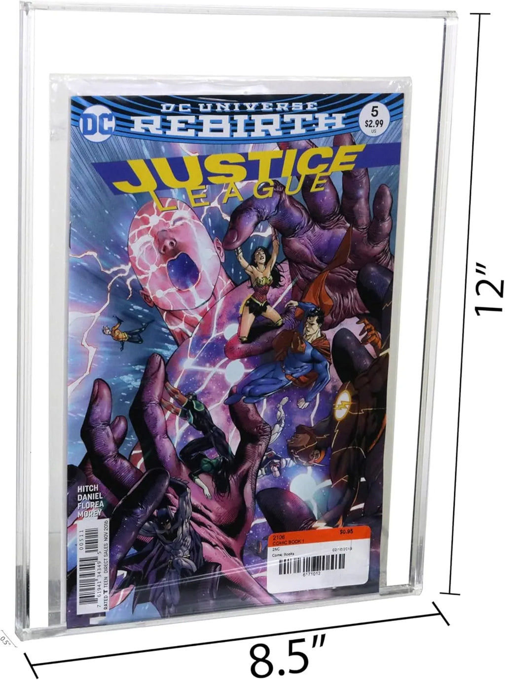 The dimensions of our comic book display case ensure a perfect fit for your collectibles. The outside dimensions of 8.5 inches long, 0.5 inches deep, and 12 inches high, and inside dimensions of 8.25 inches long, 0.25 inches deep, and 11.15 inches high. Please check the size of your item before purchasing. Thank you!