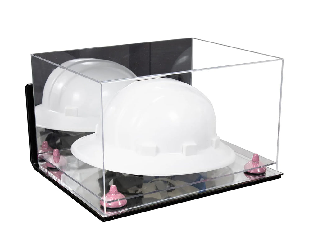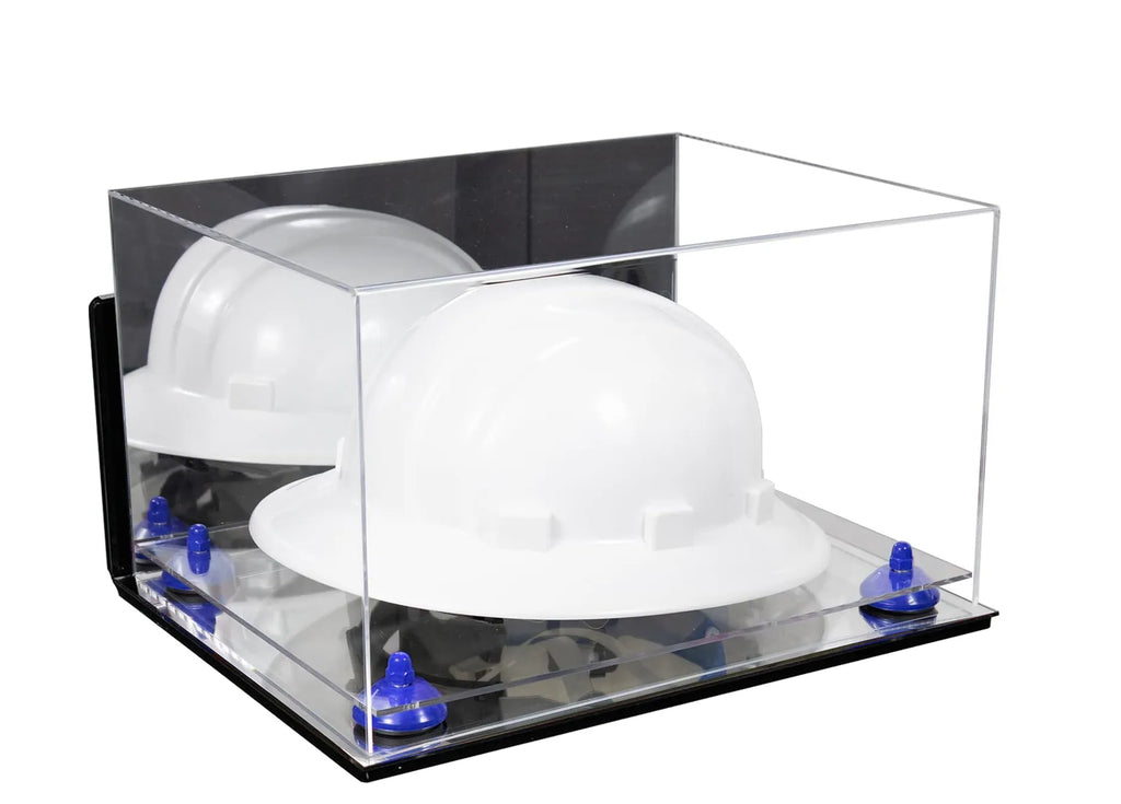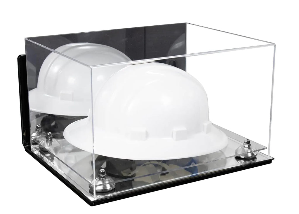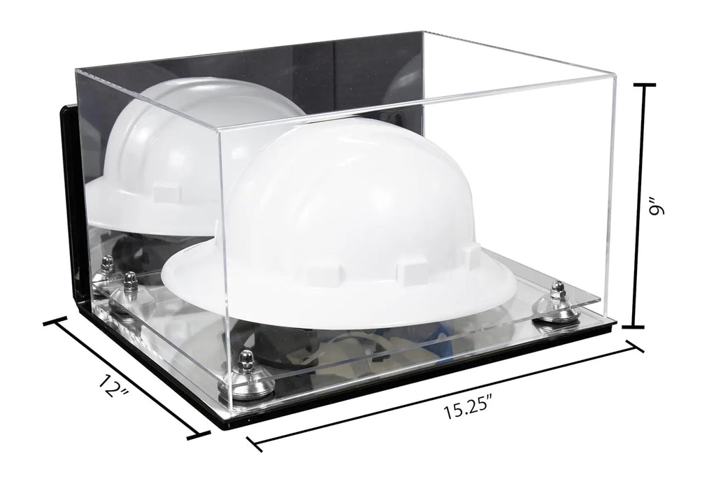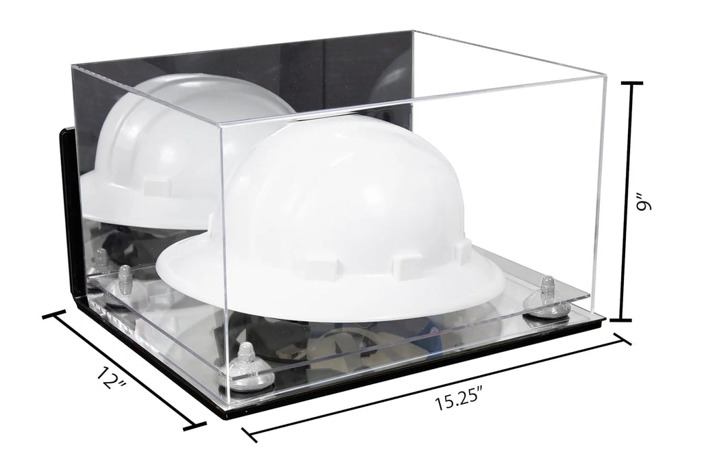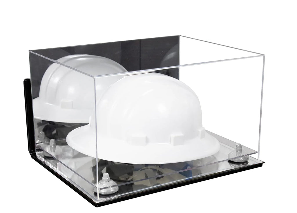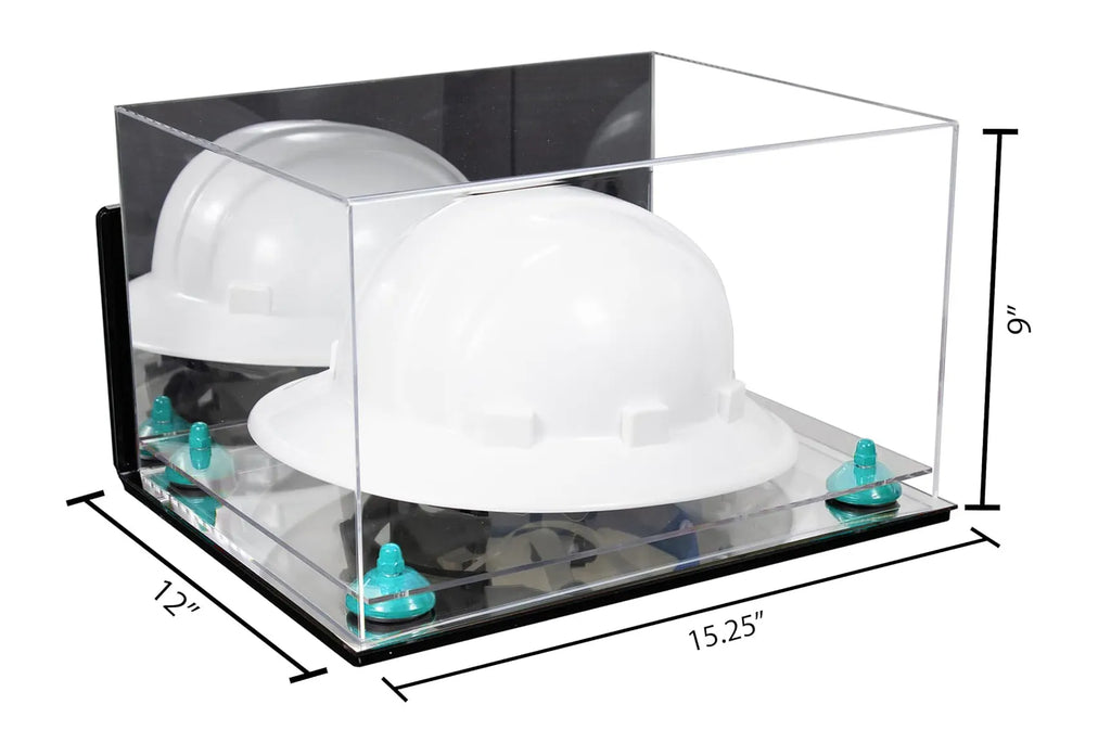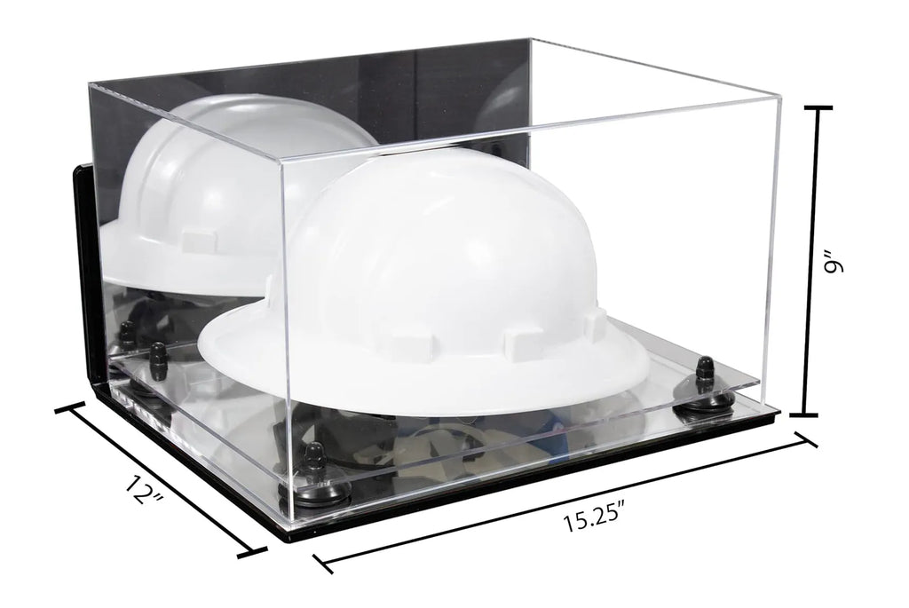 Protect and display your memorable hard hat or same sized memorabilia. in one of our beautiful, high-quality display cases. This display case will make your memorabilia stand out and provide protection from damage caused by dust, spills, fingerprints, light or simply something falling on top of it. This case is constructed of 1/8 crystal clear, durable high clarity acrylic. Front and top of case are made from one piece of acrylic (plexiglas), giving an aesthetically pleasing rollover appearance with fewer seams. Back is mirrored.
