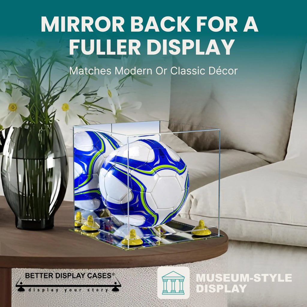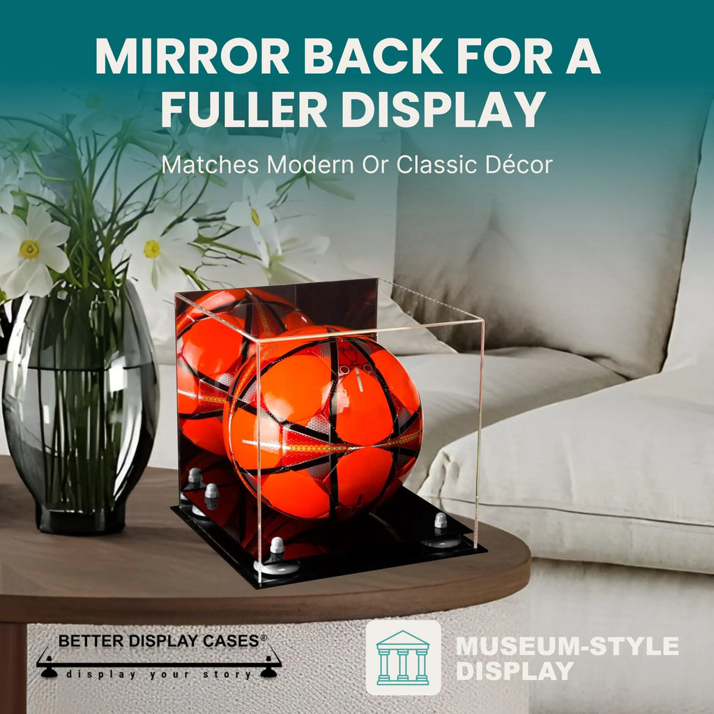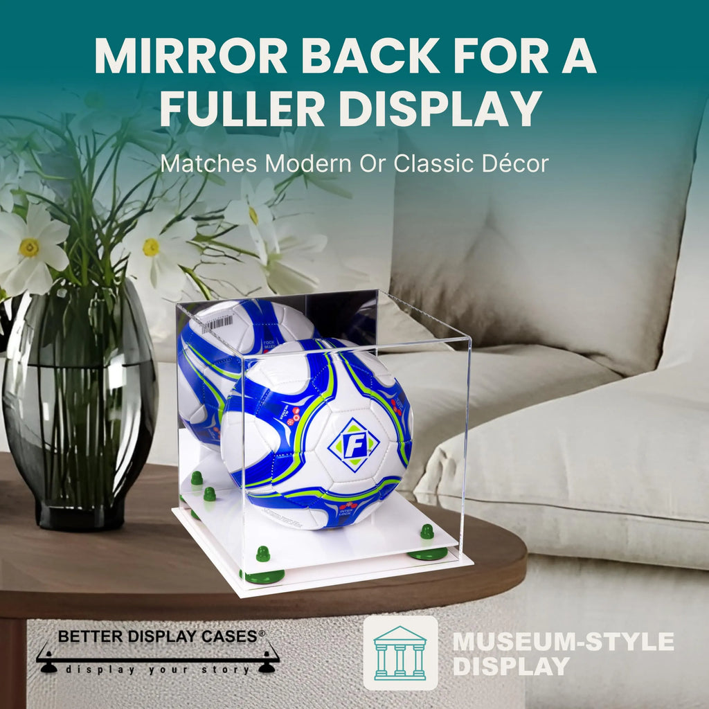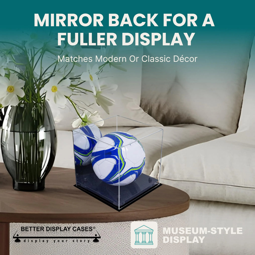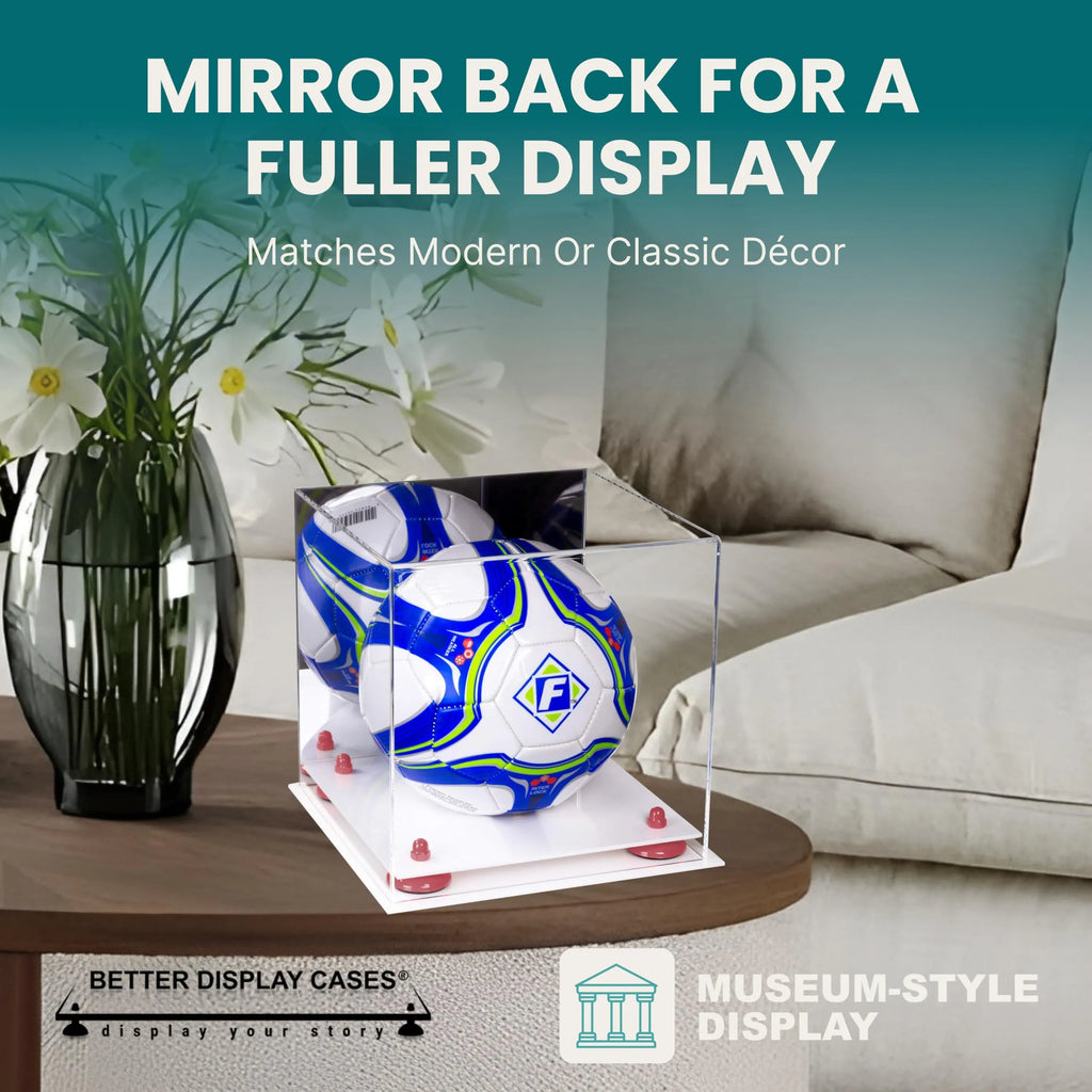 The Acrylic Soccer Ball Display Case is precisely crafted to provide an excellent fit for your collectibles. The external dimensions are 9.75 inches long, 9.75 inches deep, and 9.75 inches high. Inside, the case measures 9.5 inches in length, 9.5 inches in depth, and 8.9 inches in height above the platform with risers. Without risers 9.5 inches in length, depth, and 9.5 inches in height. These dimensions ensure your soccer ball is displayed securely while being protected from external elements. This is the mirrored, non-wall-mounted version of the case. For the wall-mounted version, please click here.