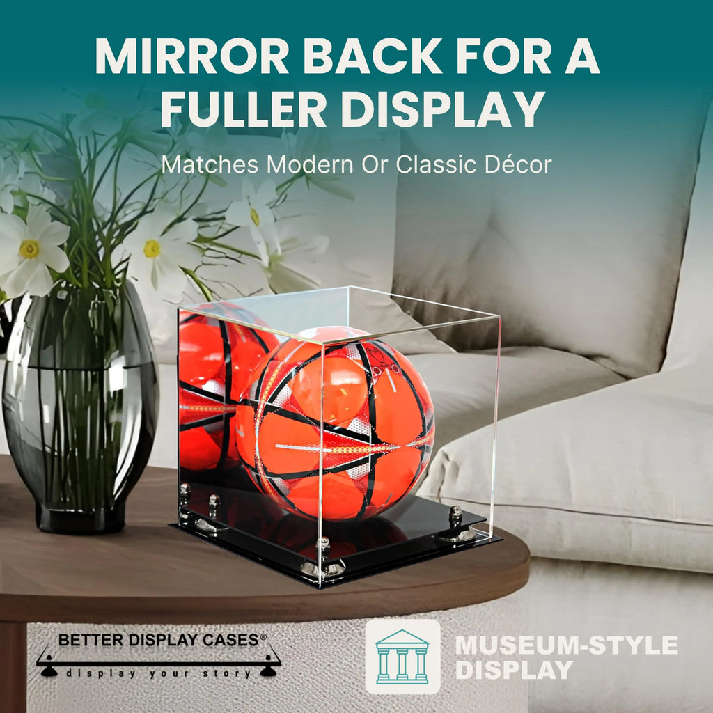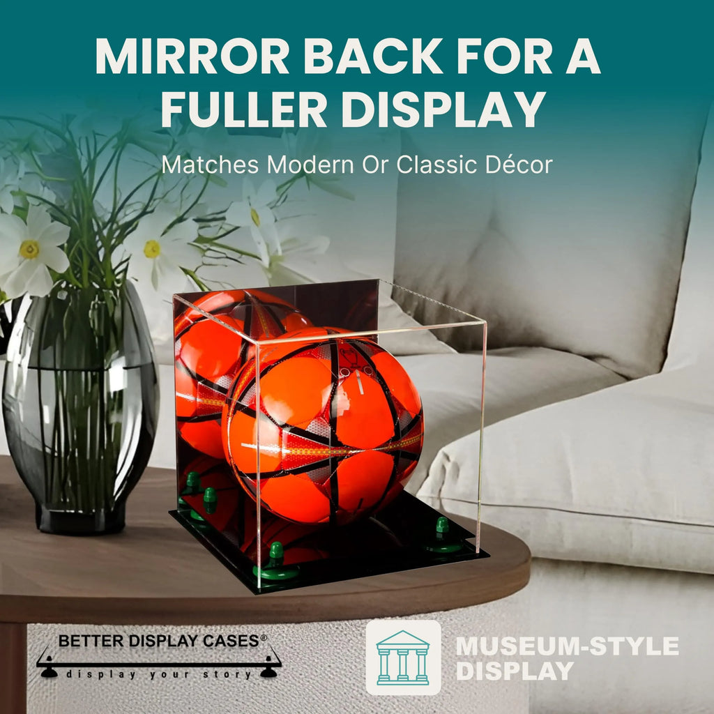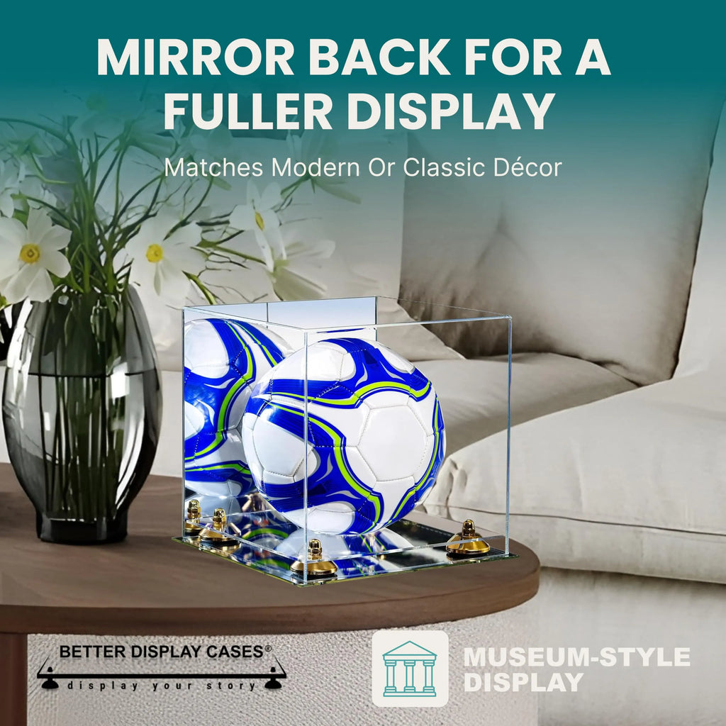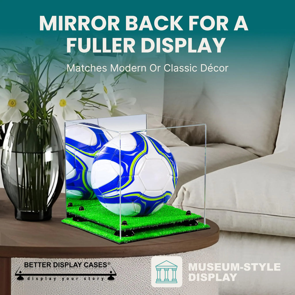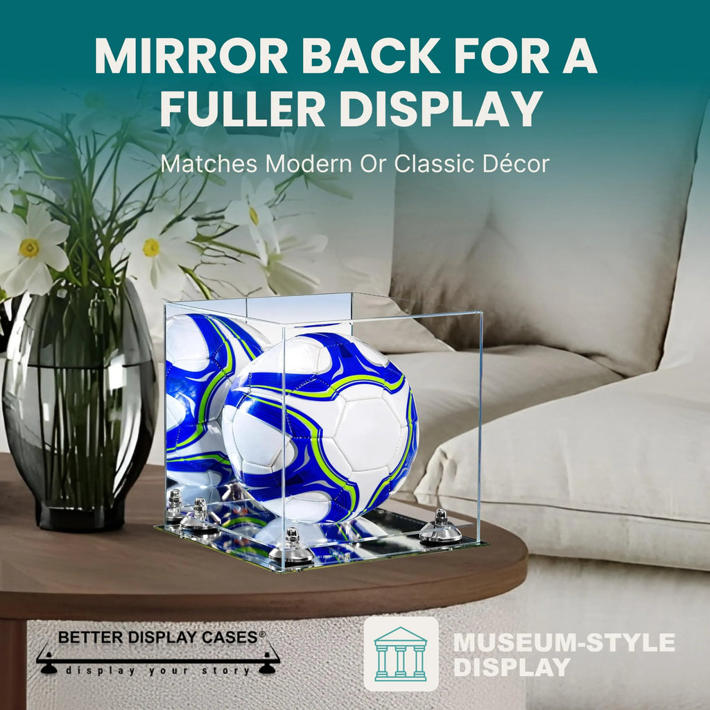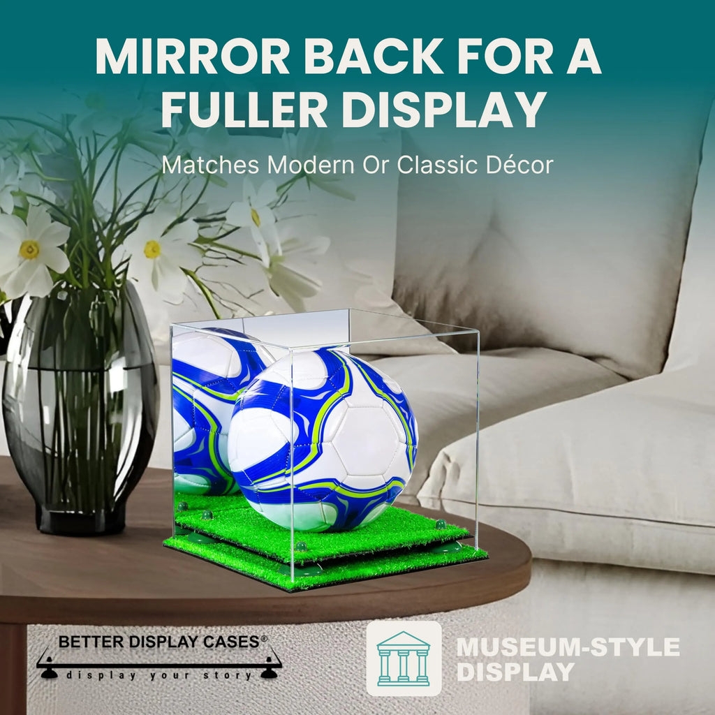 The Acrylic Soccer Ball Display Case is precisely crafted to provide an excellent fit for your collectibles. The external dimensions are 9.75 inches long, 9.75 inches deep, and 9.75 inches high. Inside, the case measures 9.5 inches in length, 9.5 inches in depth, and 8.9 inches in height above the platform with risers. Without risers 9.5 inches in length, depth, and 9.5 inches in height. These dimensions ensure your soccer ball is displayed securely while being protected from external elements. This is the mirrored, non-wall-mounted version of the case. For the wall-mounted version, please click here.