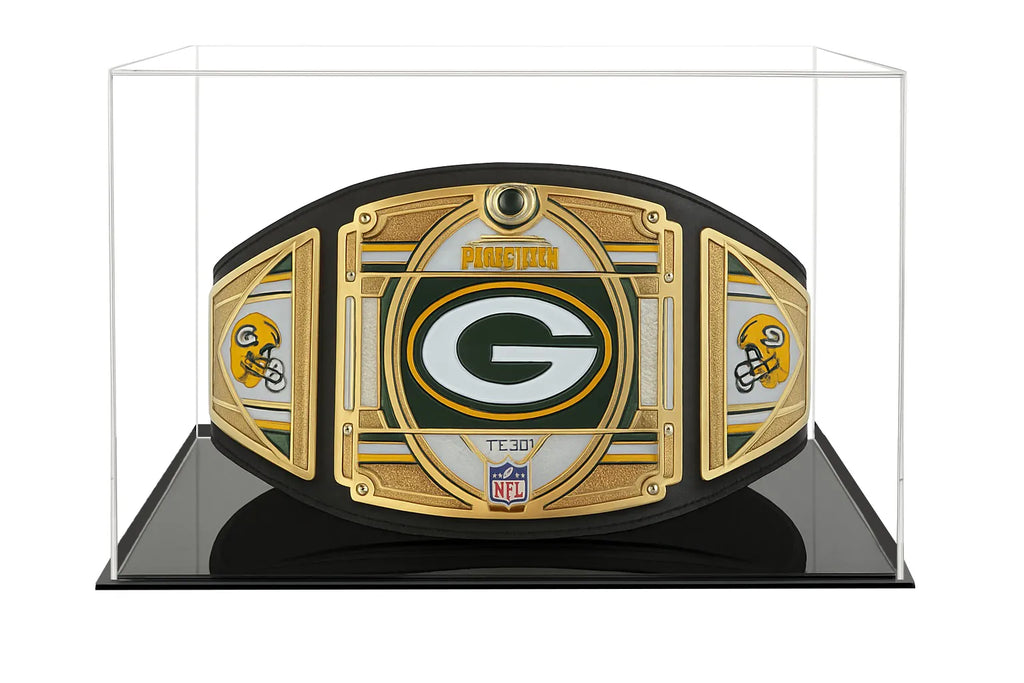 Protect and display your collectible Wrestling Belt in one of our beautiful, high-quality display cases. This display case will make your memorabilia stand out and provide protection from damage caused by dust, spills, fingerprints, light or simply something falling on top of it. This case is constructed of 1/8" crystal clear, durable, high clarity acrylic. Front and top of case are made from one piece of acrylic (plexiglas), giving an aesthetically pleasing rollover appearance with fewer seams. Back is clear.